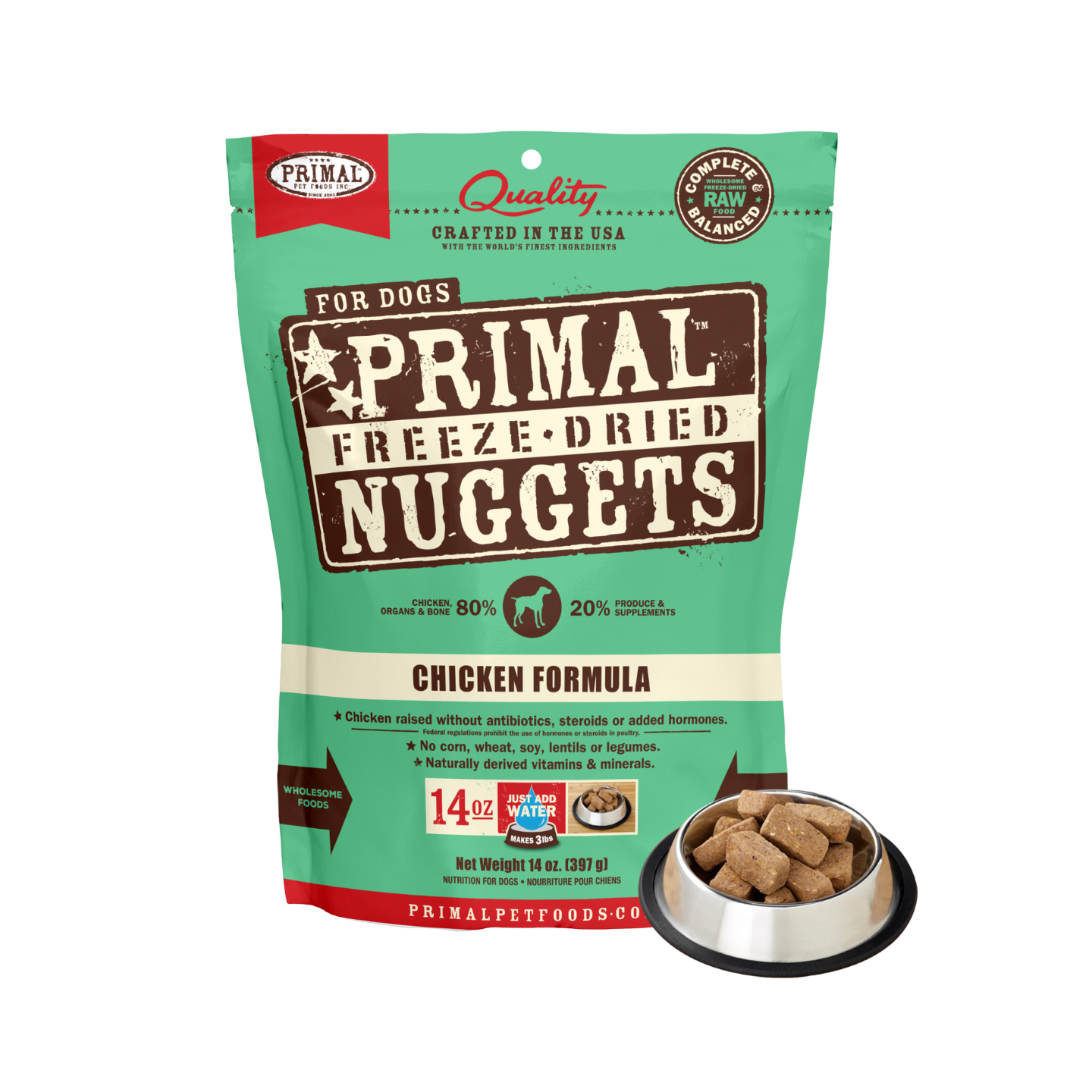 Itβs easy to feed your dog real, whole foods that deliver optimal nutrition and digestibility with Primal Freeze-Dried Raw Nuggets. Our Chicken Recipe freeze-dried raw dog food is free from synthetic vitamins and minerals and features crate-free pork raised without antibiotics, steroids, or added hormones. Simply crumble, hydrate with warm water, and serve!